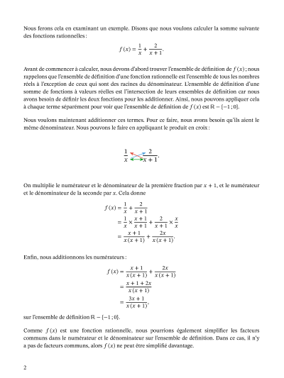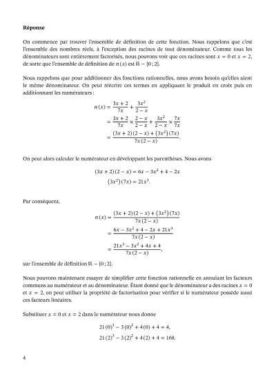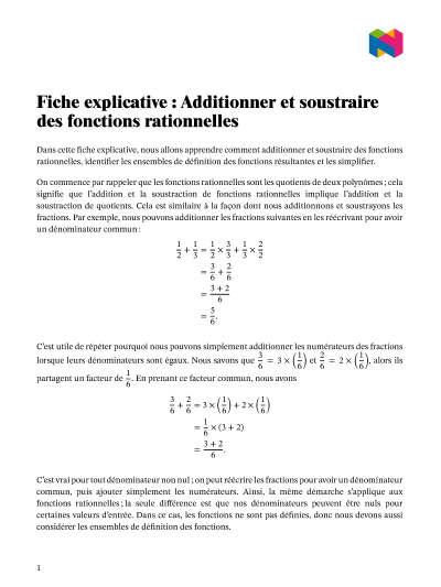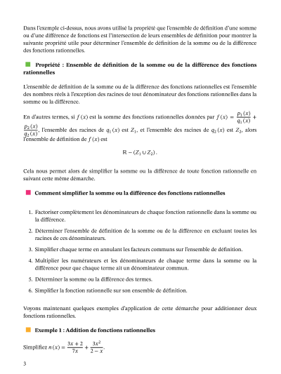 Dans cette leçon, nous allons apprendre comment additionner et soustraire des fonctions rationnelles, et comment identifier les ensembles de définition des fonctions résultantes et comment les simplifier.
