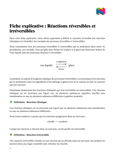 Dans cette leçon, nous allons apprendre à définir la réversibilité dans les réactions chimiques, et à identifier des exemples de processus réversibles et irréversibles.