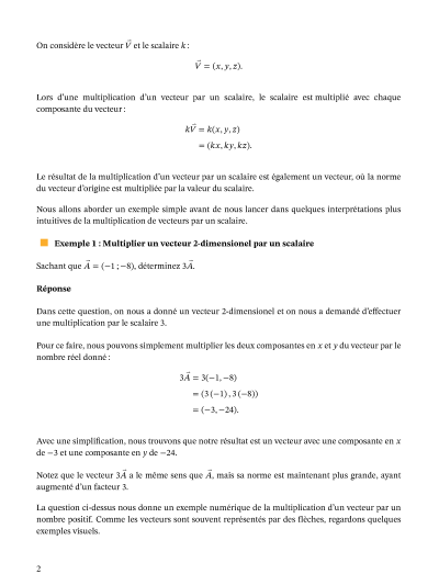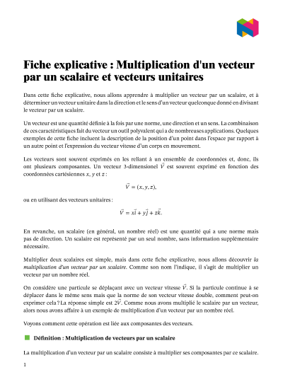 Dans cette leçon, nous allons apprendre à multiplier un vecteur par un scalaire, et à déterminer un vecteur unitaire dans la direction et le sens d'un vecteur quelconque donné en divisant le vecteur par un scalaire.