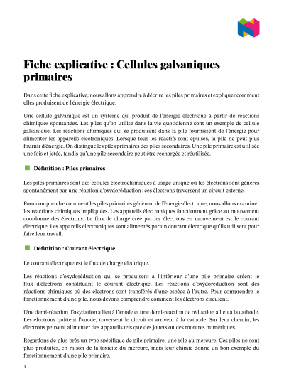 Dans cette leçon, nous allons apprendre à décrire les piles primaires et expliquer comment elles produisent de l’énergie électrique.